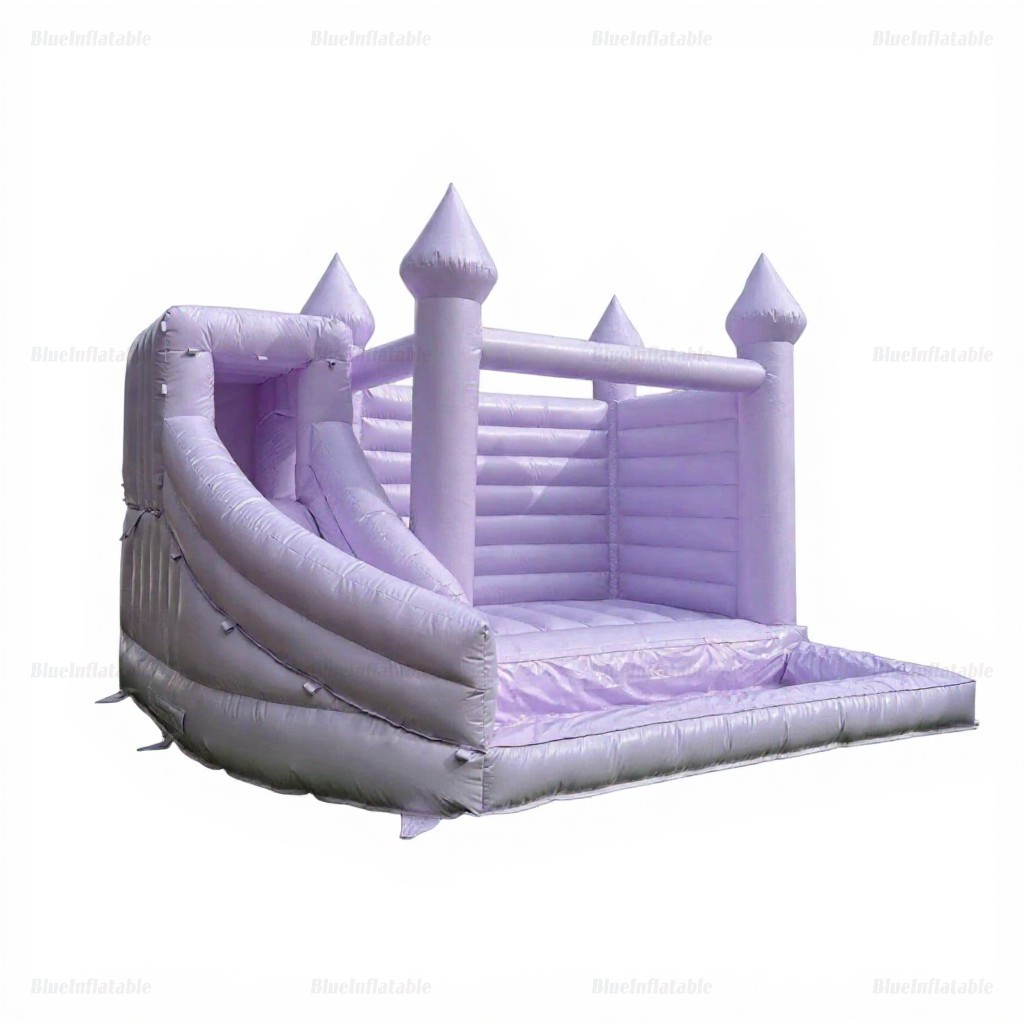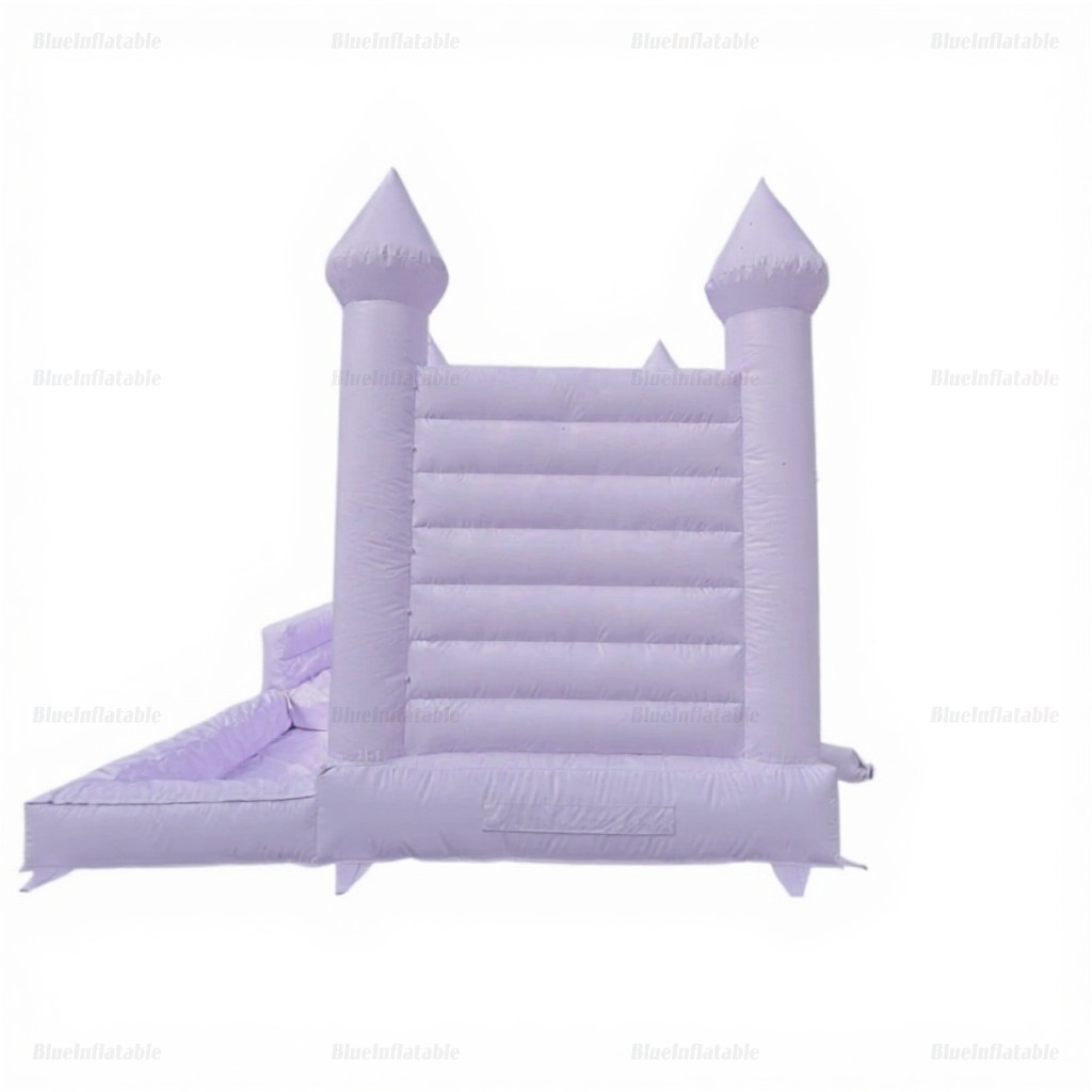 Bring vibrant fun to any event with this pastel purple bounce house, featuring a spacious slide. Durable, certified, and complete with repair kits for long-lasting enjoyment.