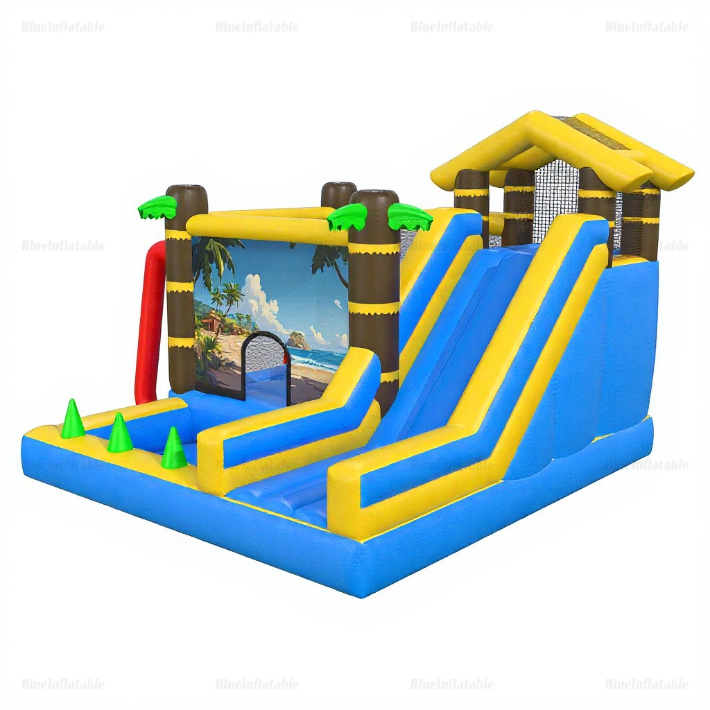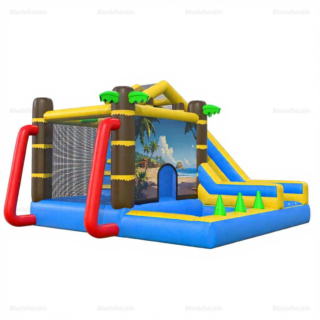 Transform your backyard into a tropical paradise! This vibrant inflatable features a bounce house, water slide, and splash pool—perfect for outdoor parties, family fun, or rental businesses. Durable, easy to set up, and ideal for ages 5 and up. Includes a 2-year warranty and free logo printing.