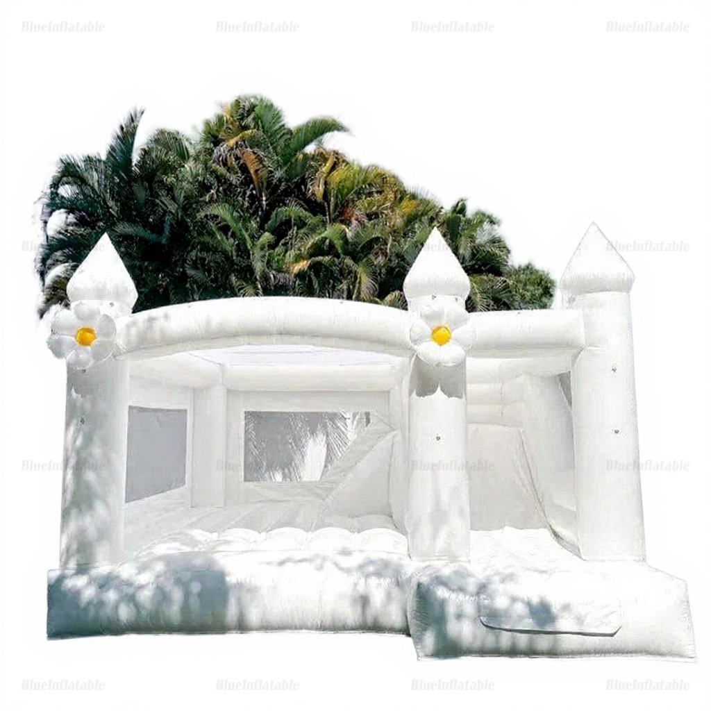 Perfect for parties or rental businesses, this customizable white inflatable bounce house features a built-in slide. Durable, heat-sealed construction ensures long-lasting fun. Certified for safety and easy to set up.